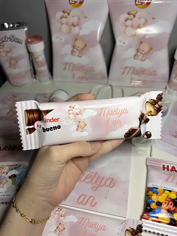 Transformez ces douceurs en créations uniques grâce à la personnalisation de leur emballage. Inscrivez un prénom, un message, une date ou apposez le logo de votre entreprise pour ajouter une note d’originalité à vos événements. Parfaits pour un mariage, une fête d’anniversaire, une baby shower ou une opération marketing, ces Kinder Bueno personnalisés marquent les esprits tout en régalant les papilles.